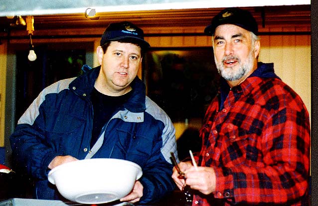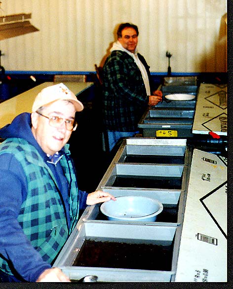 Basil Eby and Larry DeMoore checking out salmon fry.