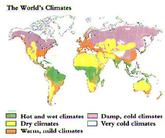 The type of weather a place usually has over a long period of time is called its climate. Climate depends on several things. One of these is latitude, or how far north or south of the Equator a place is. Another is its closeness to the sea. Places near the sea often have milder climates than places far inland. The world has five main bands of climate. Lands around the Equator have tropical, rainy climates. Deserts have dry climates. Places midway between the Poles and the Equator have temperate climates. Places near the Poles have damp, cold climates and the Poles themselves have very cold climates.
